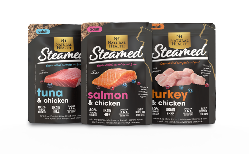 100% natuurlijk langzaam gestoomde vlees en vis.